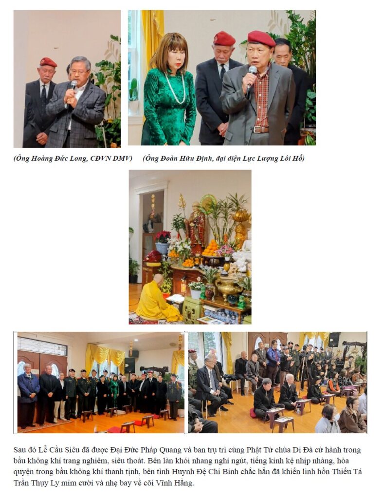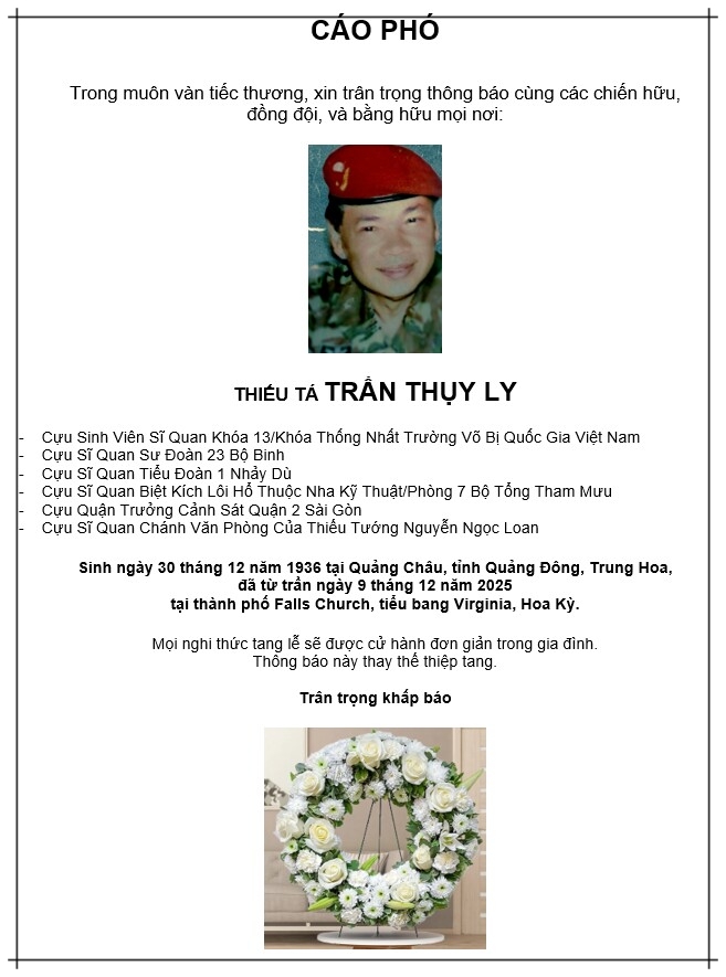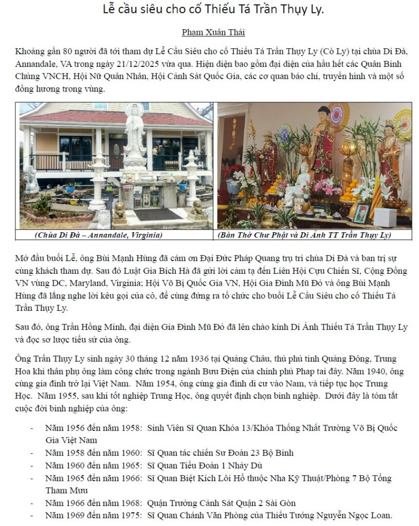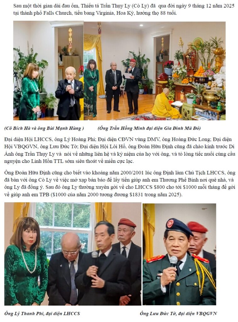 Ngày 10/12/2025, tôi nhận được email từ Luật Gia Phạm Bích Hà, thứ nữ của cố Thiếu Tướng Phạm Văn Đỗng, thông báo: “Hôm qua (ngày 9 tháng 12), sau gần 10 năm đau ốm, cuối cùng anh Trần Thụy Ly đã ra đi. Không thân nhân bên cạnh, không tài sản, tiền bạc. Một người bạn vong niên của ông, anh Chữ Quốc Anh, đã làm thủ tục giấy tờ xin chi phí hỏa thiêu của chính phủ, và mọi chuyện đã được giải quyết. Thân xác ông trong vòng khoảng 1 tuần nữa, sẽ được đưa vào phòng thiêu, giản dị, không tang lễ, không thăm viếng, không bất cứ điều gì. Phần xác của ông đã coi như giải quyết xong, nhưng còn phần hồn. Linh hồn người lính già chắc cảm thấy tủi lắm khi ra đi đơn lạnh như vậy! Vậy nên Bích Hà muốn xin những Hội Đoàn Quân Nhân có thể nào đứng ra tổ chức cho ông 1 lễ cầu siêu nhỏ ở một ngôi chùa trong vùng, như tiễn đưa cuối cùng cho người lính Trần Thụy Ly được ra đi thanh thản trong tiếng kinh tiếng mõ hay không?”