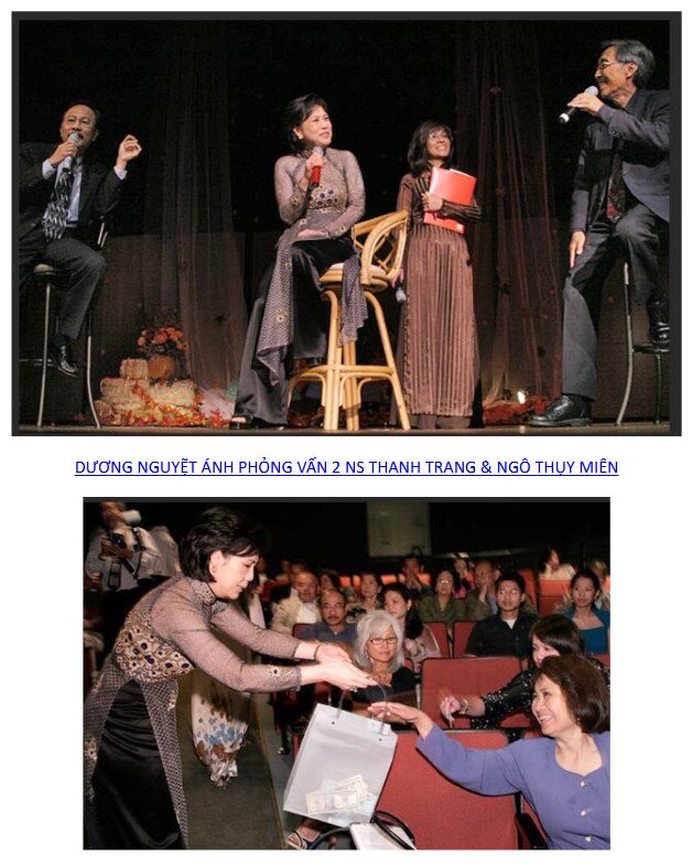TÔI CÒN NHỚ RẤT RÕ: NĂM 2008 MỘT BAN TỔ CHỨC NHỎ NHƯ HÌNH Ở DƯỚI ĐÃ “CAN ĐẢM” TỔ CHỨC MỘT BUỔI VĂN NGHỆ MANG TÊN “TÌNH KHÚC MÙA THU” VỚI SỰ CÓ MẶT CỦA 2 NHẠC SĨ THANH TRANG TỪ CALIFORNIA, NGÔ THỤY MIÊN TỪ TIỂU BANG WASHINGTON VÀ KHOA HỌC GIA DƯƠNG NGUYỆT ÁNH. ÔNG CÒ LY VÀ MỘT SỐ THÂN HỮU TRONG VÙNG CŨNG GIÚP TAY ĐỂ BUỔI VĂN NGHỆ ĐƯỢC THÀNH CÔNG VỚI NHIỀU NGƯỜI ĐẾN THAM DỰ. HÔM ẤY, BÀ DƯƠNG NGUYỆT ÁNH CŨNG KHÔNG QUẢN NGẠI ĐI XUỐNG KHÁN GIẢ XIN THÊM ỦNG HỘ ĐỂ GIÚP THƯƠNG PHẾ BINH VIỆT NAM Ở QUÊ NHÀ.