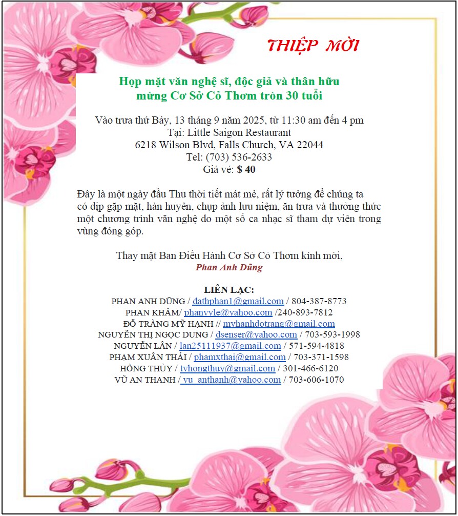 SATURDAY 13 THÁNG 9, 2025 11:30 AM - 4 PM LITTLE SAIGON RESTAURANT FALLS CHURCH, VIRGINIA 22044
