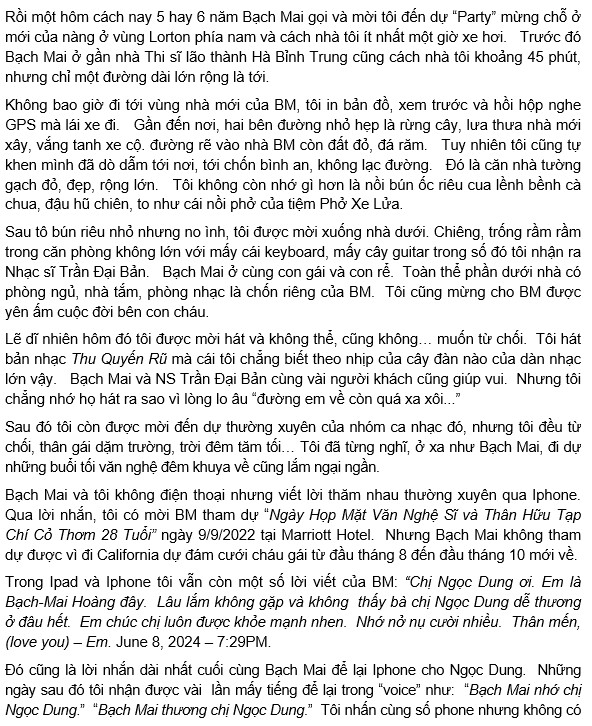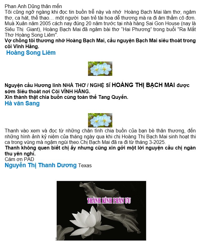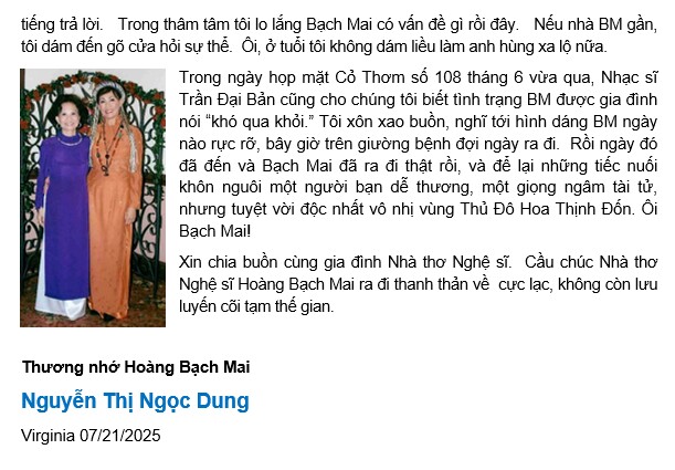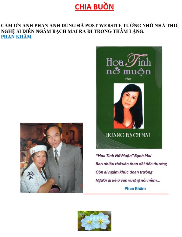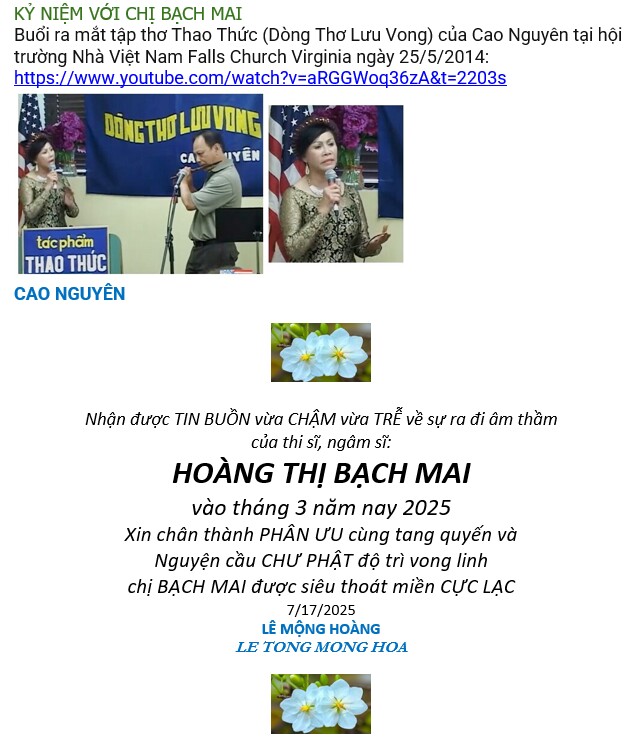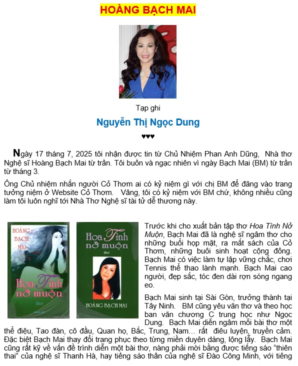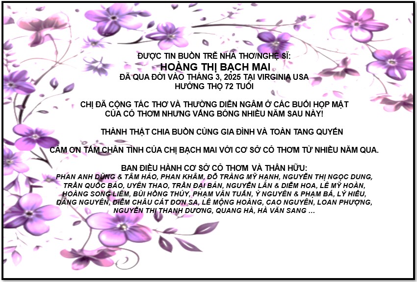NHà THơ/NGHệ Sĩ HoàNG THị BạCH MAI QUA đờI THáNG 3, 2025 TạI VIRGINIA, USA